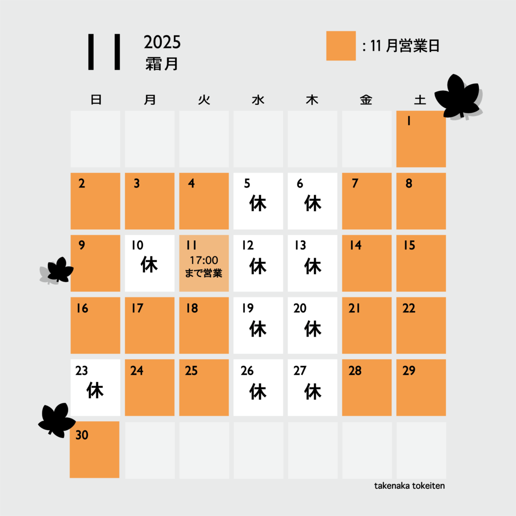 【2025年11月の営業日のお知らせ】 2025/10/31 11月の営業日 寒くなり始めましたね♪年末に近づき始めて… お待ちしております! 11月10日(月) 臨時休業 11月11日(火)17:00まで営業 11月23日(日) 臨時休業 スマホで閲覧の方は、下のアイコンをタップしていただければお電話できます。